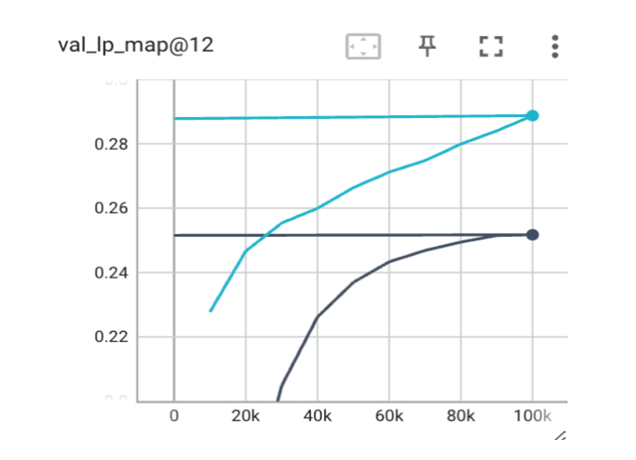 However, the client could improve the model further. While examining the learning curves shown below, which show the MAP@12 metric computed on the validation set with respect to the number of training iterations, they noticed an important detail. The settings for maximum iterations and epochs of training were enough for the initial model to converge (i.e., the learning curve was almost saturated), but they were not enough for the higher capacity model – the learning curve was not yet saturated. This clearly implied that more iterations and epochs of training would improve the model performance.