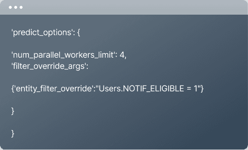 Here the parallelism is set to 4 through num_parallel_workers_limit. This reduced the end-to-end runtime by more than 50%. Moreover, the following filter override argument, ‘entity_filter_override’:”Users.NOTIF_ELIGIBLE = 1″, constraints batch prediction output only to users satisfying the NOTIF_ELIGIBLE = 1 condition. By combining both improvements, our client reduced the end-to-end runtime from 24+ hours to the 4~5 hour level.
