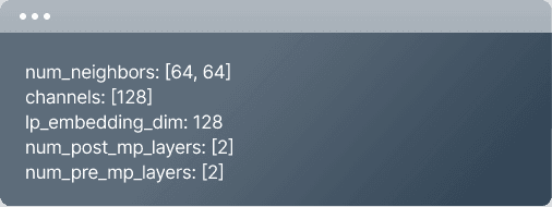 This configuration overrides the number of neighbors used in GNN by 64 (num_neighbors), and makes all the dimensions of embeddings (lp_embedding_dim) and hidden layers (channels) 128, which doubles over the default value of 64. Furthermore, the number of MLP layers is set to 2 for both input (num_pre_mp_layers) and output (num_post_mp_layers). This approach obtained about 6% better performance than the initial model in terms of MAP@10 (for new store recommendation).