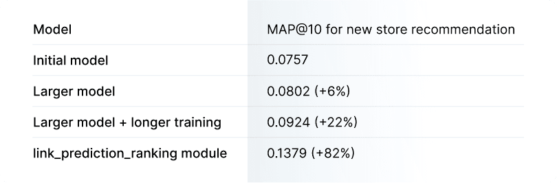 Given the success of the above model improvement iteration journey, the client set up a new A/B experiment with the improved model. However, recall that the existing pipeline consumes the embeddings and obtains store rankings via the dot product. Consequently, the deployment of the larger but still embedding focused model was straightforward since the consumption strategy is the same. On the other hand, the deployment of the link_prediction_ranking model, which provides the largest boost in model quality, required some additional engineering development since we are no longer consuming embeddings but instead predictions directly. To expedite the impact on business metrics, our client decided to deploy the larger model (trained for longer) first – making sure that the model quality improvements were enough to show value in the A/B test. At the same time they were continuing to develop the proper pipeline to consume the prediction outcome from the link_prediction_ranking model directly.