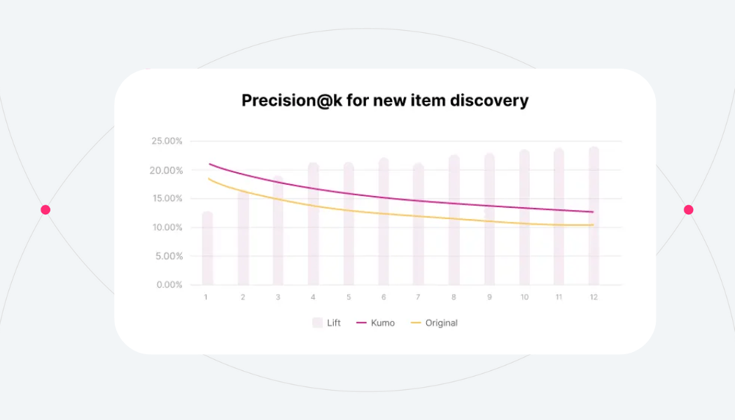 The predictions produced in Kumo were significantly more precise than those produced by the client’s internal model. They saw a 24% lift on PRECISION@12 for the new item discovery problem and a 7% lift on PRECISION@12 for the repeat item interaction problem. Their previous models were custom made and it took them several years to develop and several engineer hours a week to maintain. The Kumo model took 1 week to develop and deploy in production. From loading data, to modeling iterations, to business results. Minimal engineer hours are required to maintain it, since Kumo provides the needed SLAs for everyone’s peace of mind.