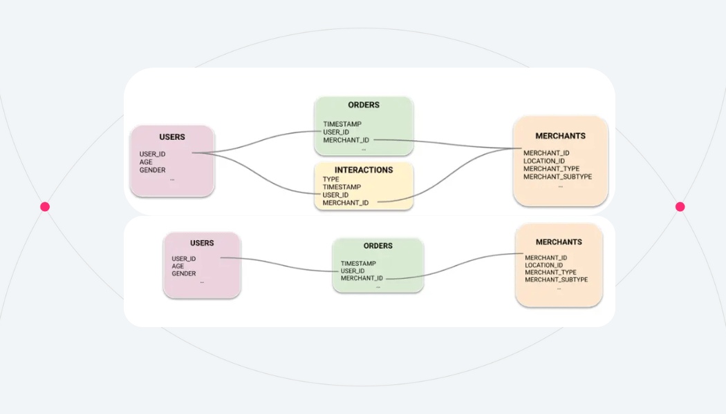 The client had four tables available for this problem: Users, Merchants, Orders, and Interactions. Users and Merchants were Dimension tables that contained static information about each entity type. In this case, a user represented one of the business’s consumers, and a merchant represented a variety of businesses such as restaurants, grocery stores, pharmacies, and more. The Orders and Interactions tables contained information that gave us signal about what merchants each user placed an order from, as well as other interactions such as searches, clicks, abandoned carts, etc. In total the data contained around 3 billion rows.