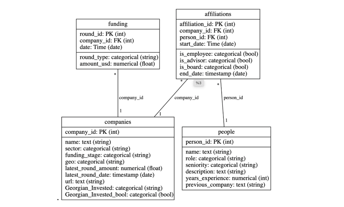 The raw data to help us find these signals already lives in part in Georgian’s internal data warehouse—companies, funding rounds, people, and their affiliations. But turning this data into actionable insights has traditionally been a slow, resource-heavy process spread across teams and requiring months of ad-hoc data wrangling, feature engineering, model building, and ongoing maintenance.
