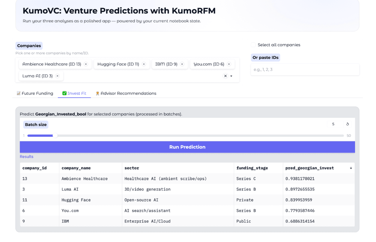 KumoRFM’s approach for generating insights from relational data (e.g., using graph neural networks and the predictive query language) makes it appealing for a small data products team like ours. We see opportunities to extend our internal tooling with Kumo at minimal cost. On the same relational spine (companies ↔ rounds ↔ affiliations), we produced interactive signals that the Georgian investment team were able to use immediately resulting in a faster, more auditable way to focus investor time. We’re actively exploring how best to bring KumoRFM into our internal workflows.