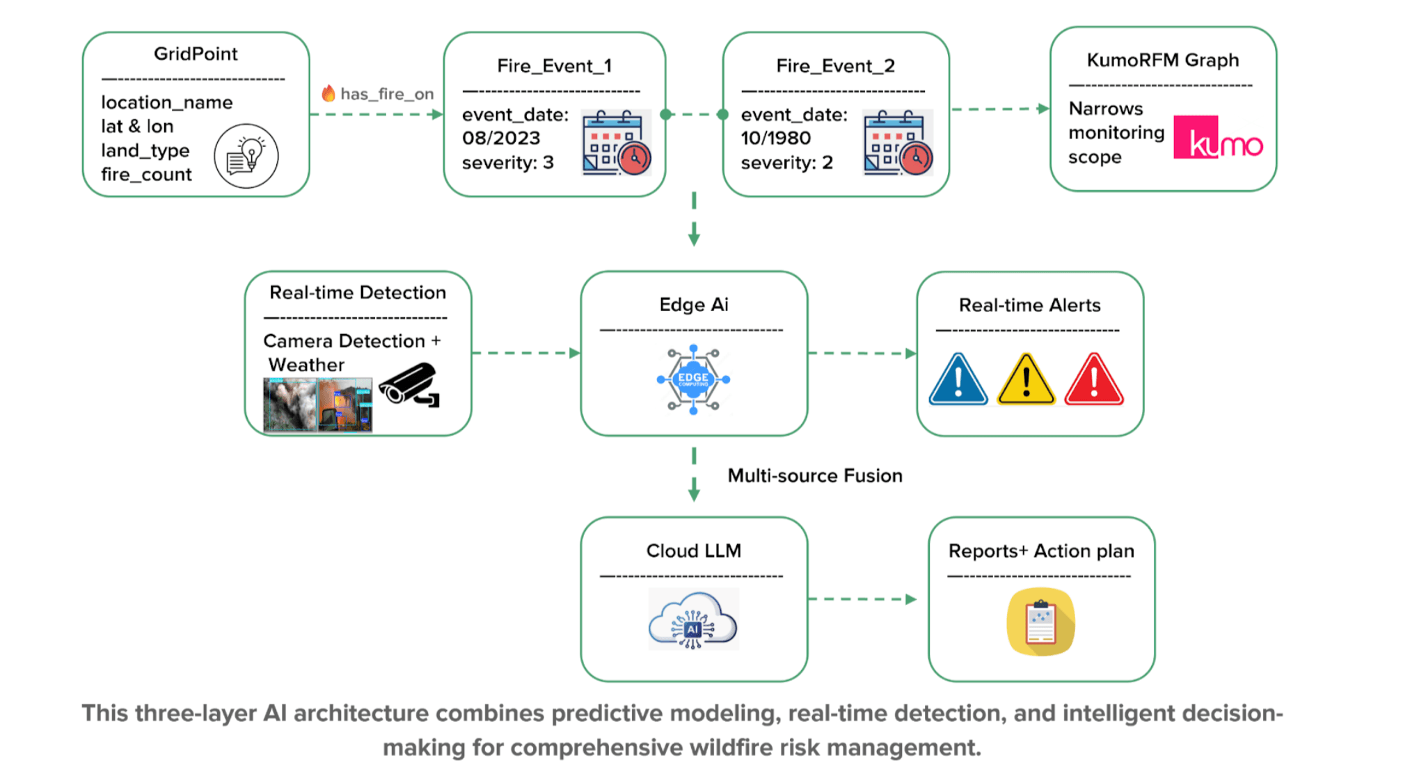 We use the KumoRFM foundation model to analyze complex relational data and predict the highest-risk wildfire zones, narrowing the monitoring scope. In these targeted areas, a network of Edge AI devices provides instant fire and smoke detection, which is then fused with other data by a Cloud LLM to generate automated, actionable emergency reports.