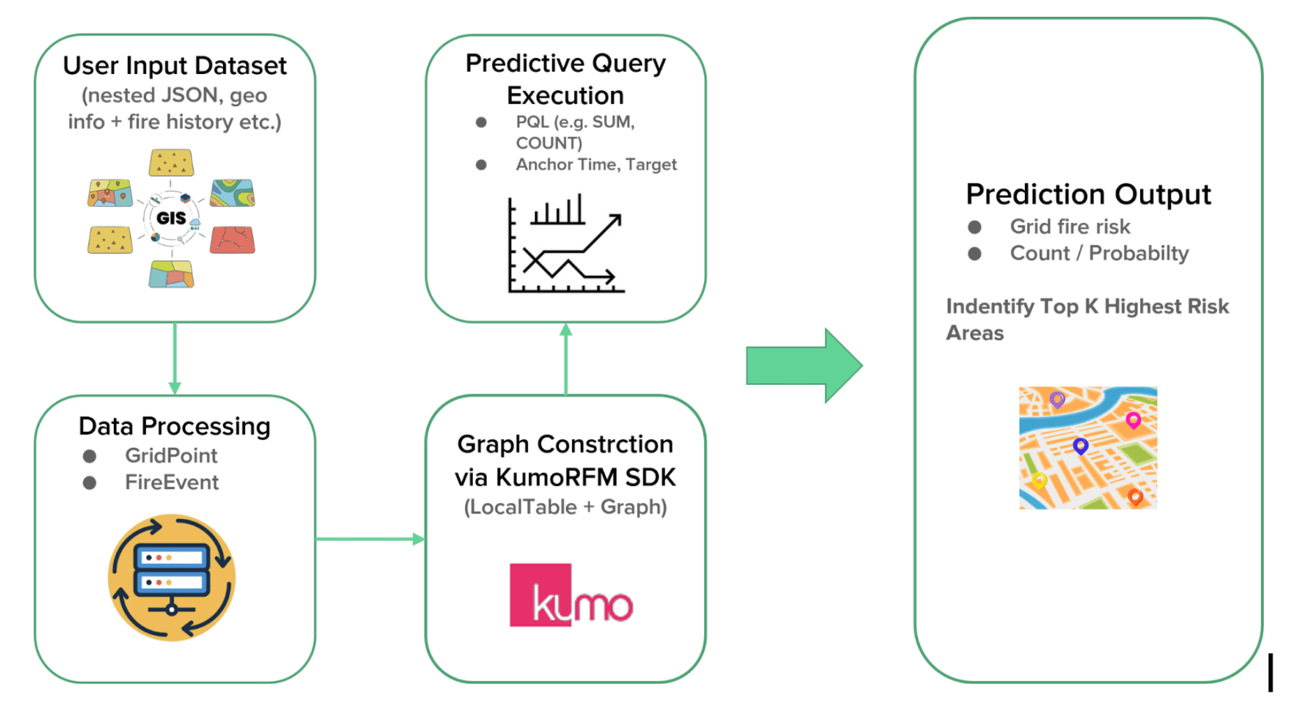 - Graph Construction: This data is processed into dataframes. The KumoRFM SDK then constructs a relational graph, automatically discovering the complex patterns between locations and their fire histories.