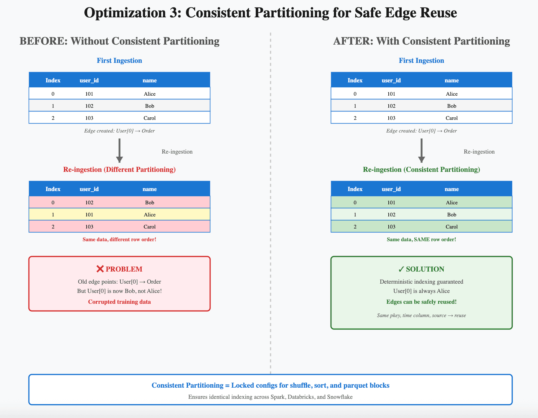 To make edge reuse safe, we needed deterministic indexing across all backends: Spark, Databricks, and Snowflake. This is what we mean by consistent partitioning.