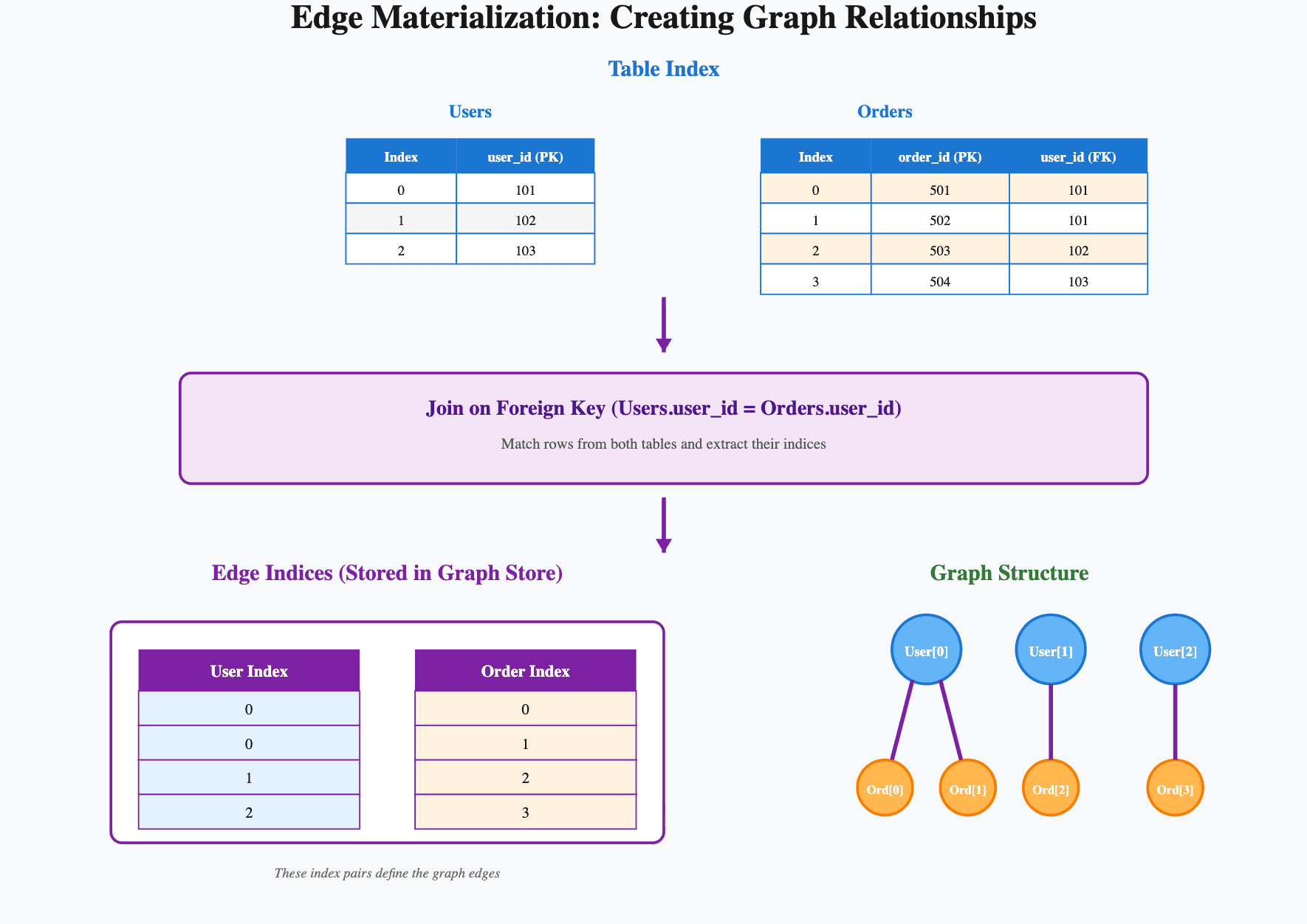 Edge materialization: Relationships between tables are created by performing join operations based on foreign keys. For example, if a "Users" table connects to an "Orders" table via a user_id, Kumo joins these tables using the contiguous indices from the previous step, and the resulting row index pairs become edges in the graph. These edges are stored in Kumo's remote graph store (also using PyTorch Geometric's remote backend).