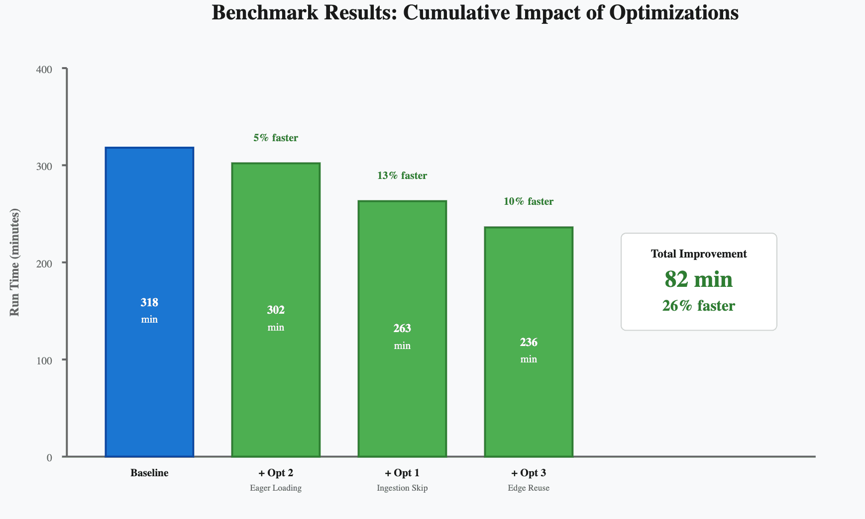 This ensures that version upgrades consistently bring real speedups to your workflows. In our benchmark, all three optimizations together reduced end-to-end runtime by ~25%.