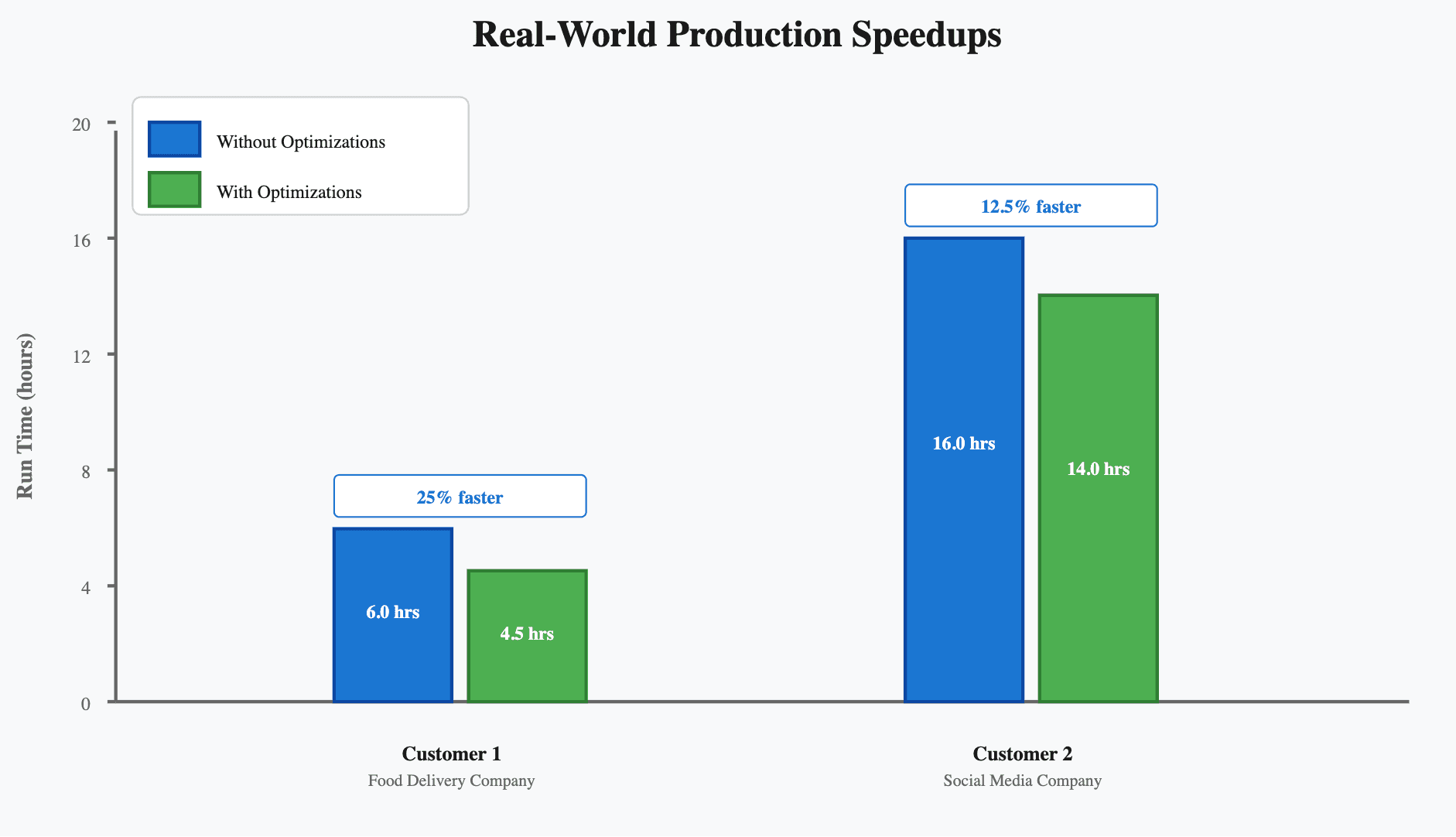 While benchmarks are useful for controlled comparisons, what matters most is how these optimizations perform on real customer jobs. We tested these optimizations on real production jobs run by a well-known large food delivery company and a major social media platform.