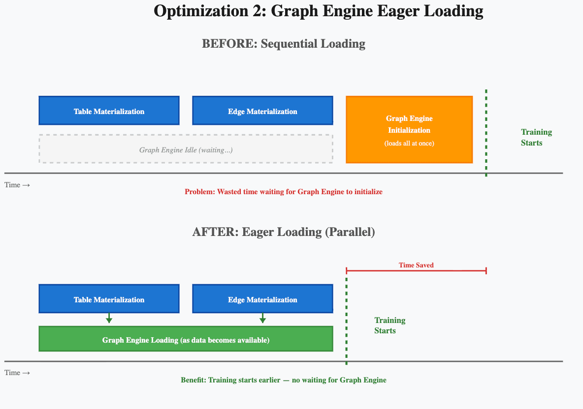 We introduced eager loading for both the feature store and graph store components of the Graph Engine. Instead of waiting for all materialization to complete before starting initialization, these components now begin loading materialized tables and edges as soon as they become available. Tables and edges are loaded into their respective stores immediately as they finish materializing. The Graph Engine is progressively warming up while other parts of the graph are still being processed.