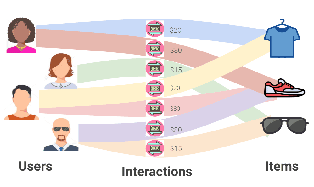 The recommendation problem forms a bipartite graph between users and items, where nodes represent the users and items, and edges represent the user-item interactions. Edges often come with timestamps. Moreover, multiple edges may exist between pairs of nodes, since a user may repeatedly interact with the same item (e.g., repeat ordering of the same product in e-commerce). Given the bipartite graph of the past interactions, a recommendation task can be cast as a link prediction task—one that calls for predicting future interactions between user nodes and item nodes.