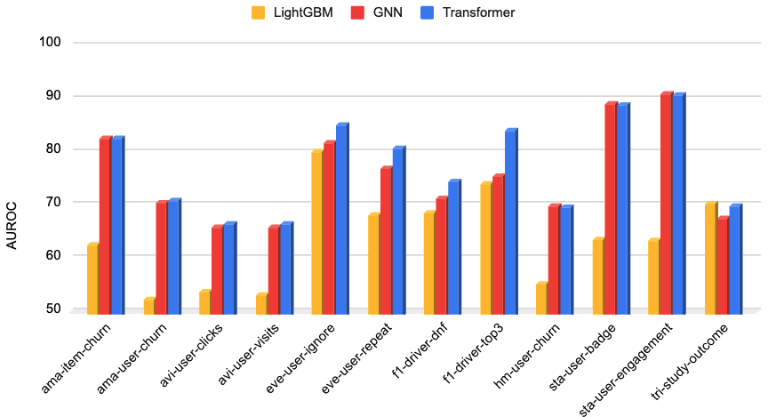 Setup: To ensure a fair comparison between Relational Graph Transformers and GNNs, we use neighbor sampling with two hops of 15 neighbors and set the node dimension to 128 for all models. For the GNN baseline, we evaluate four different hyperparameter configurations and report the best performance. For transformers, we experiment with three different hyperparameter sets and report the best average over two runs. In all transformer setups, we use four layers, eight attention heads, and set the feedforward network (FFN) dimension to 512 (four times the node dimension). Additionally, we also evaluate a LightGBM classifier baseline over the raw entity table features, to establish a comparison with classical Machine Learning methods. Note that here only information from the single entity table is used.