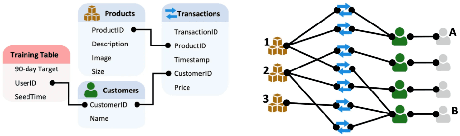 This graph is heterogeneous: each node and edge is typed based on the schema graph, allowing models to distinguish between, say, a Customer node and a Product node, or between a purchased edge and a viewed edge.